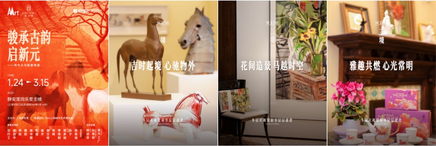 在此生态中,每一个品牌都超越了基础的商品售卖者角色,转型为持续的内容生产者与社群发动机。AArt艺先行馆的到来,标志着街区向“城市艺术展厅”的升维。它作为“年度战略艺术伙伴”,以“一核多元”模式系统性运营。其开幕特展《骏承古韵启新元》让水墨雕塑与百年建筑同频共振,未来全年不断的展览、沙龙与社群活动,将吸引艺术家、藏家与美学爱好者,使静安里成为一个持续生长的文化能量站。